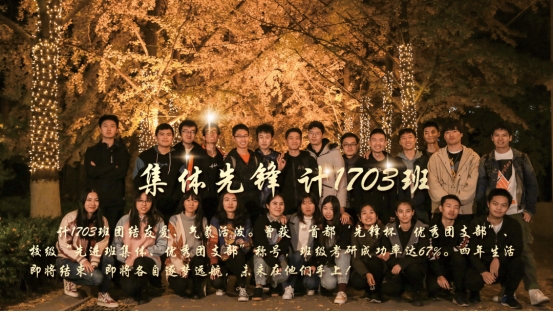 计1703班团结友爱、气氛活泼。成员即将前往各高校深造,考研成功率达67%。曾获“‘先锋杯’优秀团支部”、校级“先进班集体、优秀团支部”称号。四年生活即将结束,即将各自逐梦远航,未来在每一个我们手上