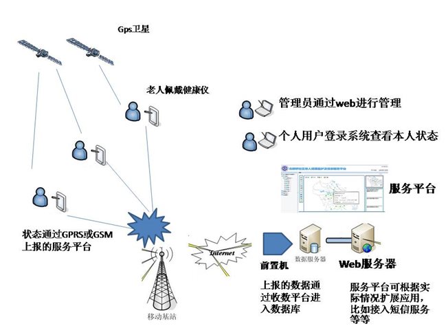 系统主要由监护平台和手持终端设备组成。通过手持终端设备GPS定位系统,可对老人的位置进行实时监控,遇到突发情况有自动报警功能,同时还具备很多个性化服务,如主动发送提示信息,终端设备自动进行语音播报;对重要的事情进行定时提醒,如按时吃药,好友生日提醒等;设置个性化铃声及背景,让老人不会感到孤独。