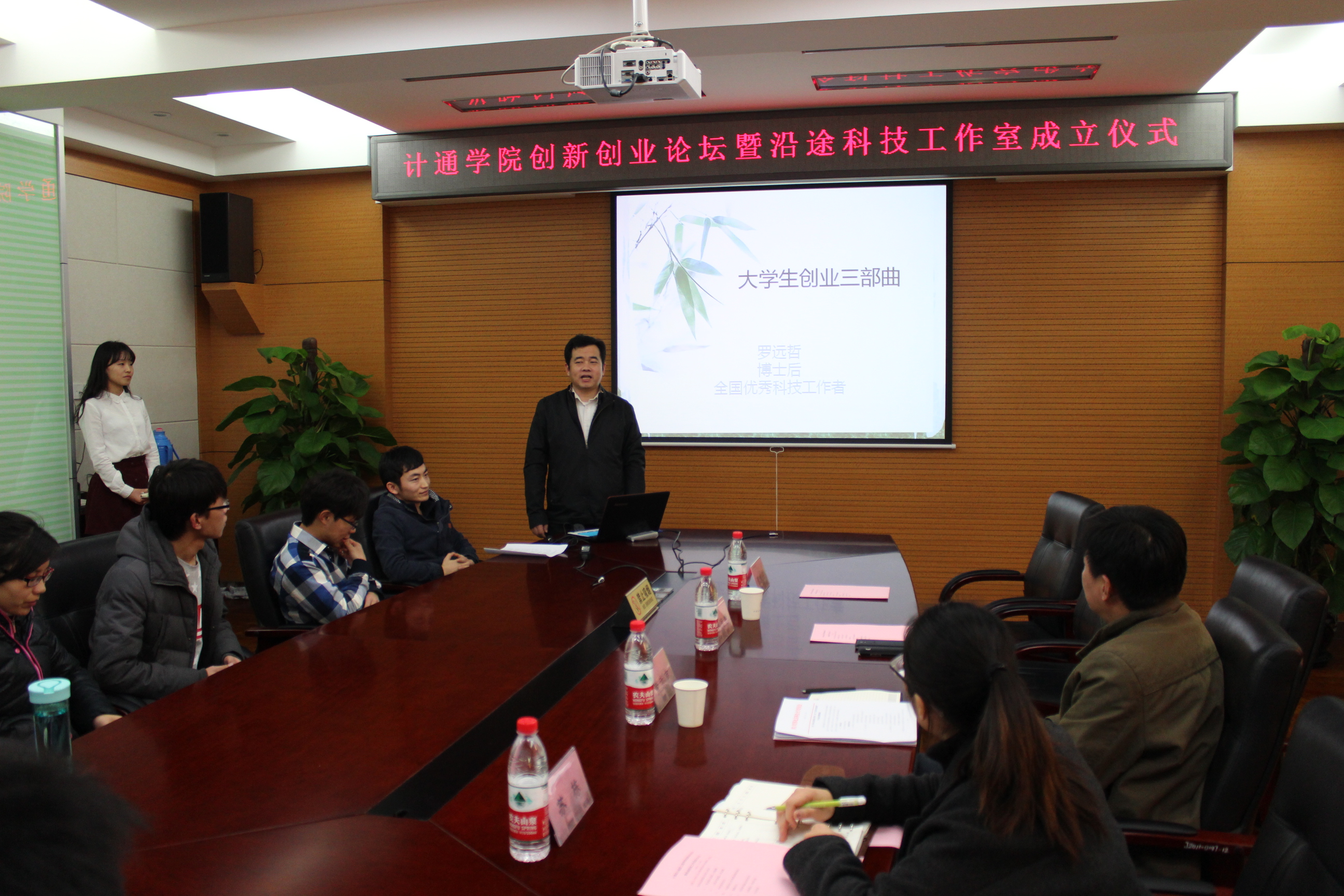 于信息楼601举行创新创业论坛暨沿途科技工作室成立仪式,浪潮北京分公司总经理罗远哲、学院党委书记黄武南、副院长张晓彤、党委副书记苏栋等出席活动。