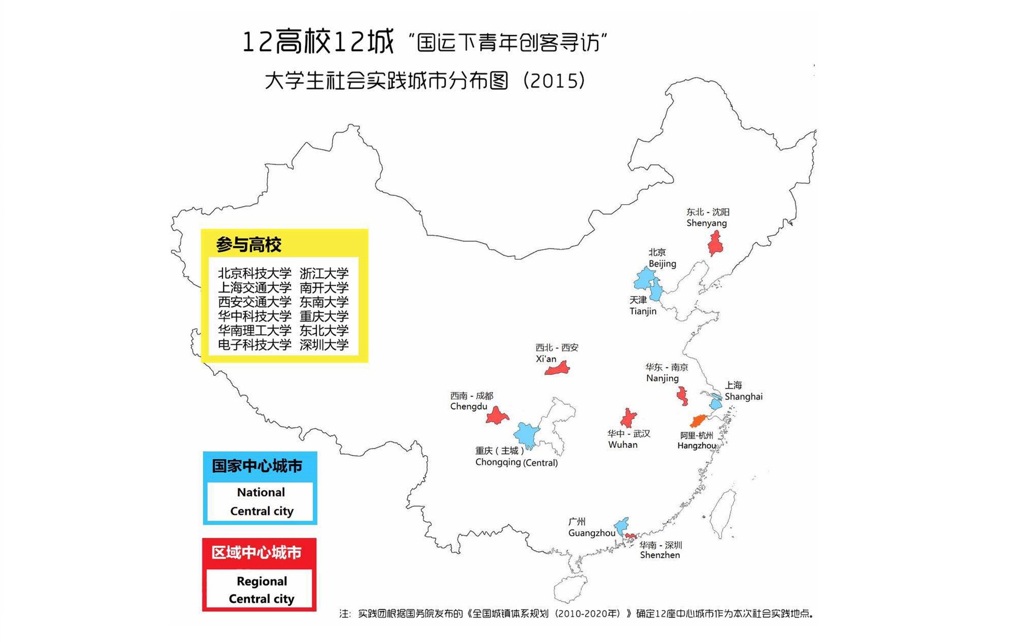 实践团根据国务院发布的《2010-2020年全国城镇体系规划》,将规划提出建设的5座国家中心城市和6座国家区域中心城市以及创新创业氛围浓厚的杭州确定为本次实践活动的地点。同时,还邀请了京外11所重点大学组建实践团队共同参与,力求本次实践活动取得实效。